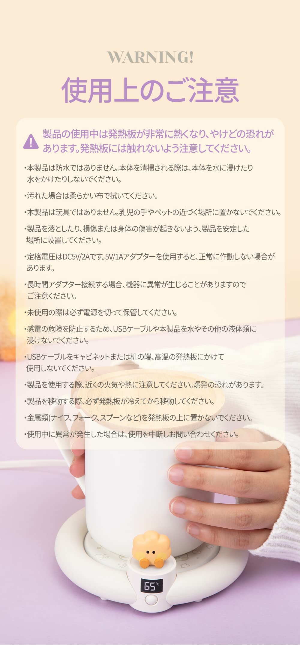 Details: -Product name: BT21 minini cup warmer -Character: KOYA RJ SHOOKY MANG CHIMMY TATA COOKY -Country of manufacture: China -Rated voltage/current: DC5V/2A -Rated output: 20W ●Materials: ABC, silicone, PVC