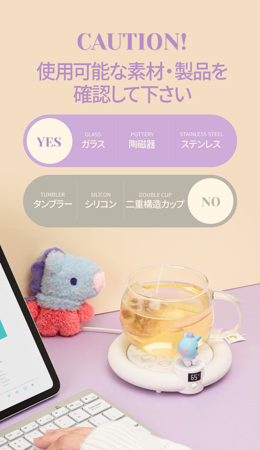 Details: -Product name: BT21 minini cup warmer -Character: KOYA RJ SHOOKY MANG CHIMMY TATA COOKY -Country of manufacture: China -Rated voltage/current: DC5V/2A -Rated output: 20W ●Materials: ABC, silicone, PVC